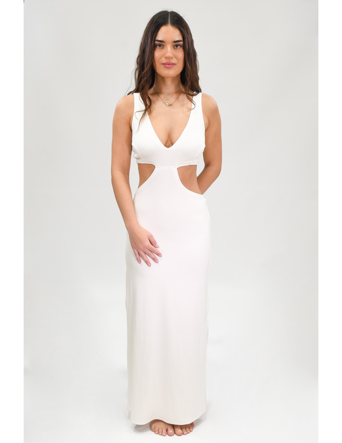 The Anna Dress is characterized by its modern and daring design. On the front, it features a deep V neckline that adds a touch of sensuality. The sides of the dress have strategic cuts that not only highlight the figure, but also provide a contemporary and fresh air.