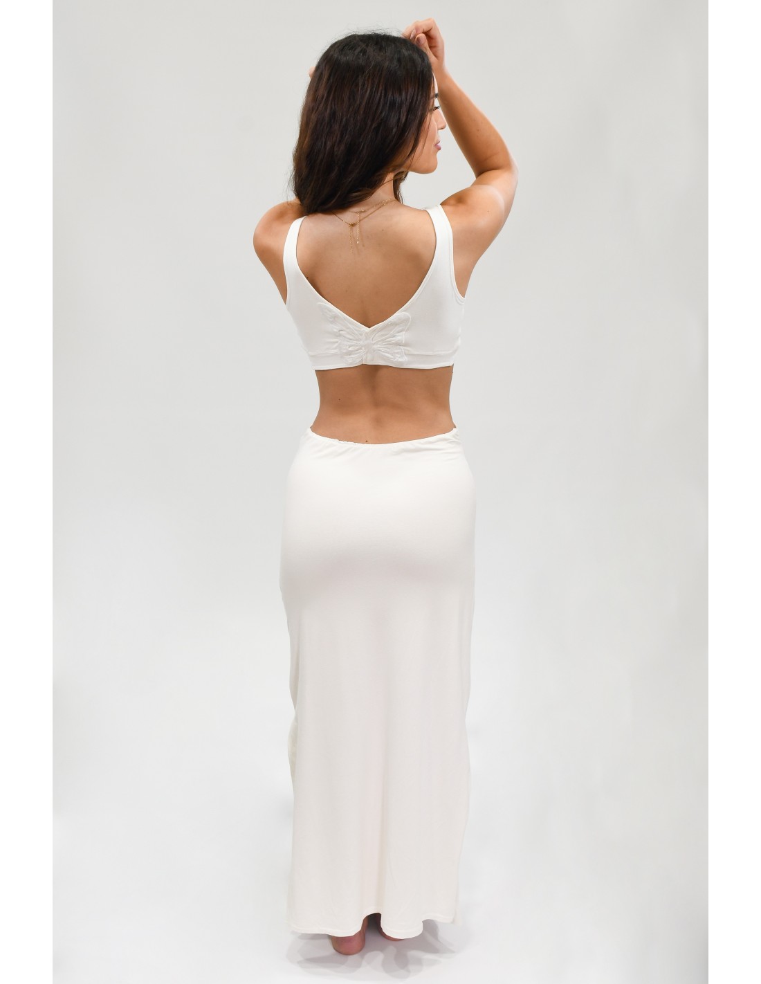 One of the most charming details of the Anna Dress is the embroidery on the back, right on the back. This embroidery has the shape of a butterfly, a symbol of transformation and beauty, which adds a distinctive and delicate touch to the design. The embroidered butterfly is precisely crafted, demonstrating Jyoko's signature high quality and attention to detail.