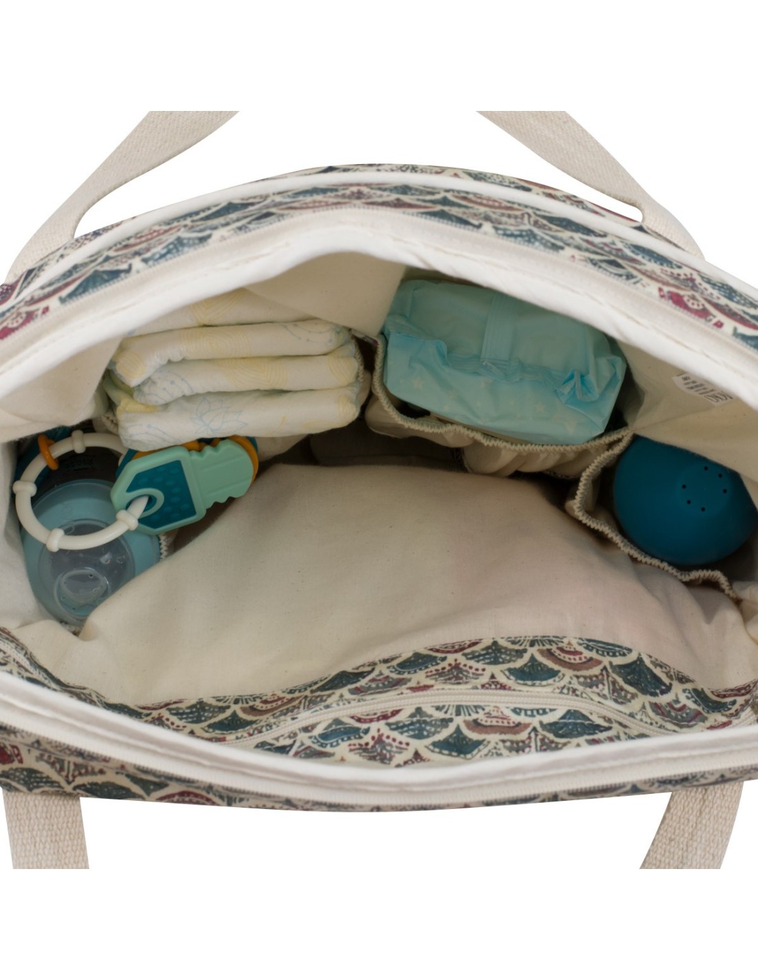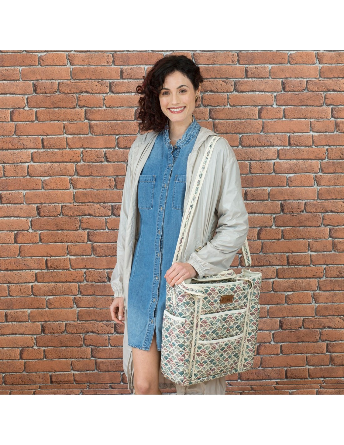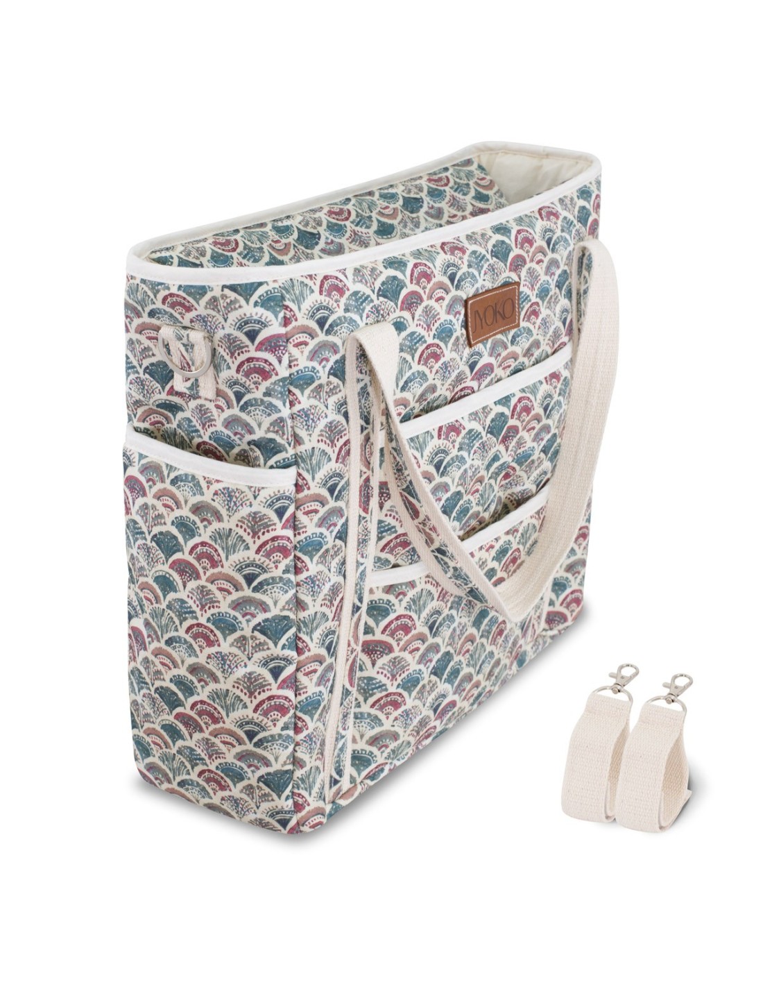 Podrás llevarla contigo en todo momento de la manera que más te convenga, ya sea agarrada de la mano o del antebrazo con sus asas, colgado o cruzado del hombro con la correa regulable extraíble o colgado del cochecito con los anclajes, todo ello incluido.