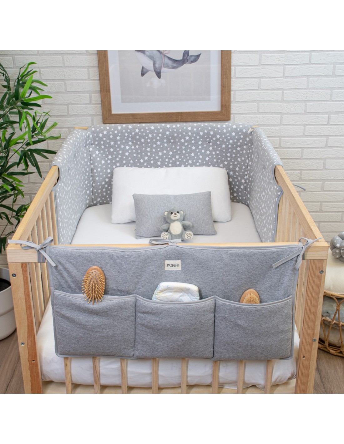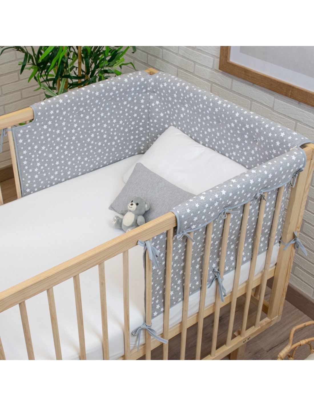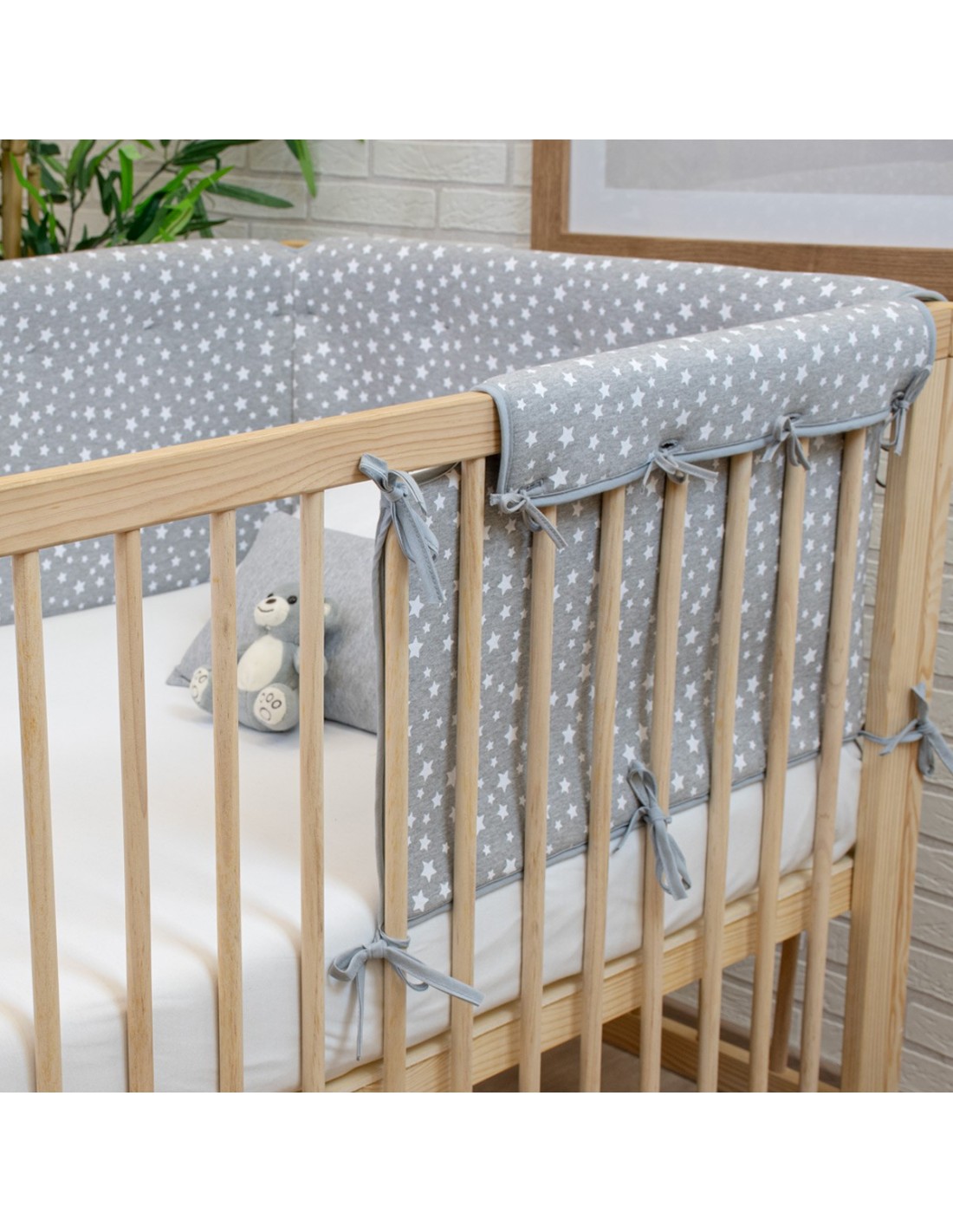 Le tour de lit est conçu pour assurer le confort et la sécurité du bébé, car il recouvre la barre supérieure et les lattes latérales du lit, empêchant le bébé de se cogner la tête et la bouche, surtout pendant la phase où il commence à se tenir debout et manque de stabilité. Le tissu extérieur est en 100% coton biologique avec un rembourrage en mousse de 10 mm d'épaisseur.