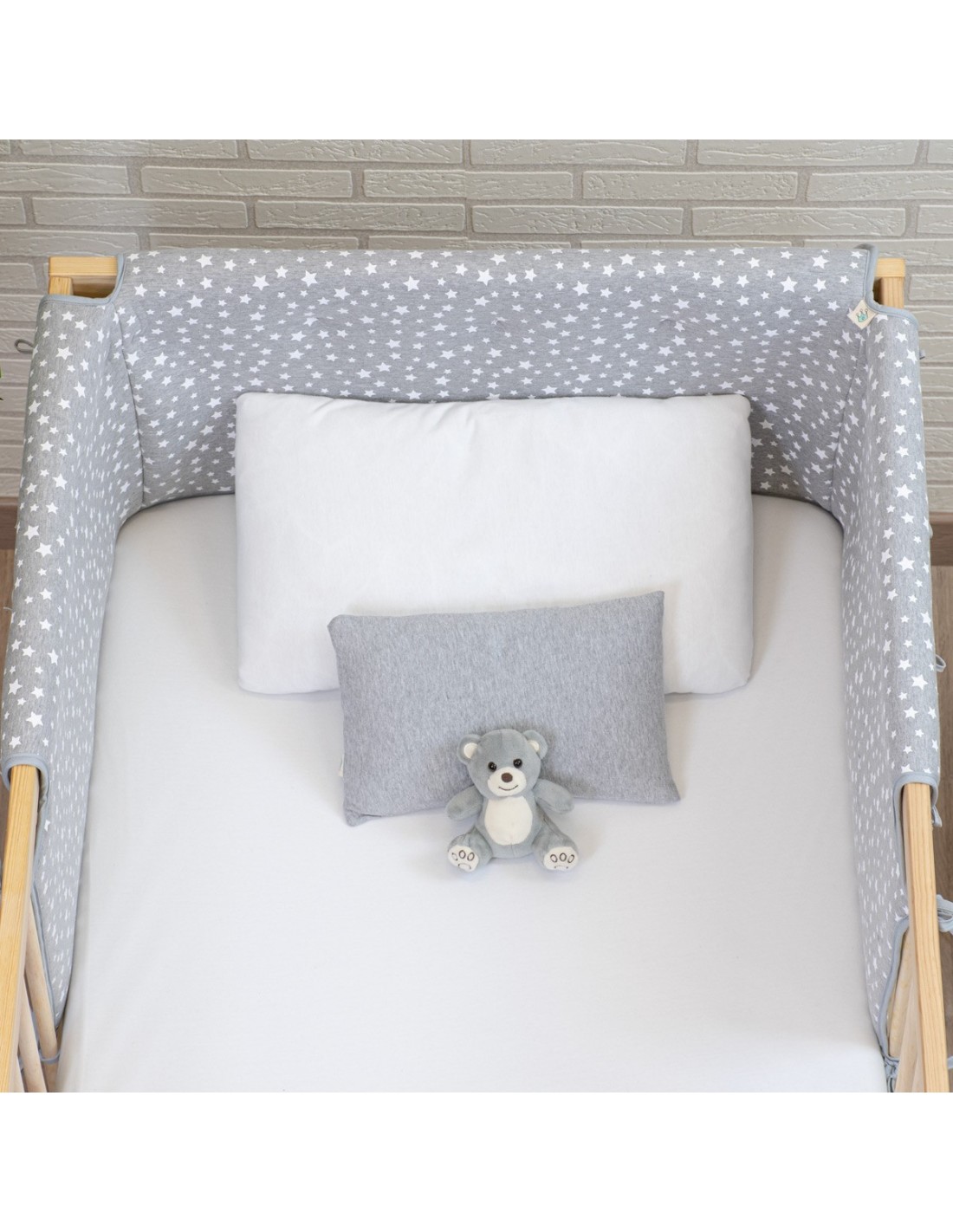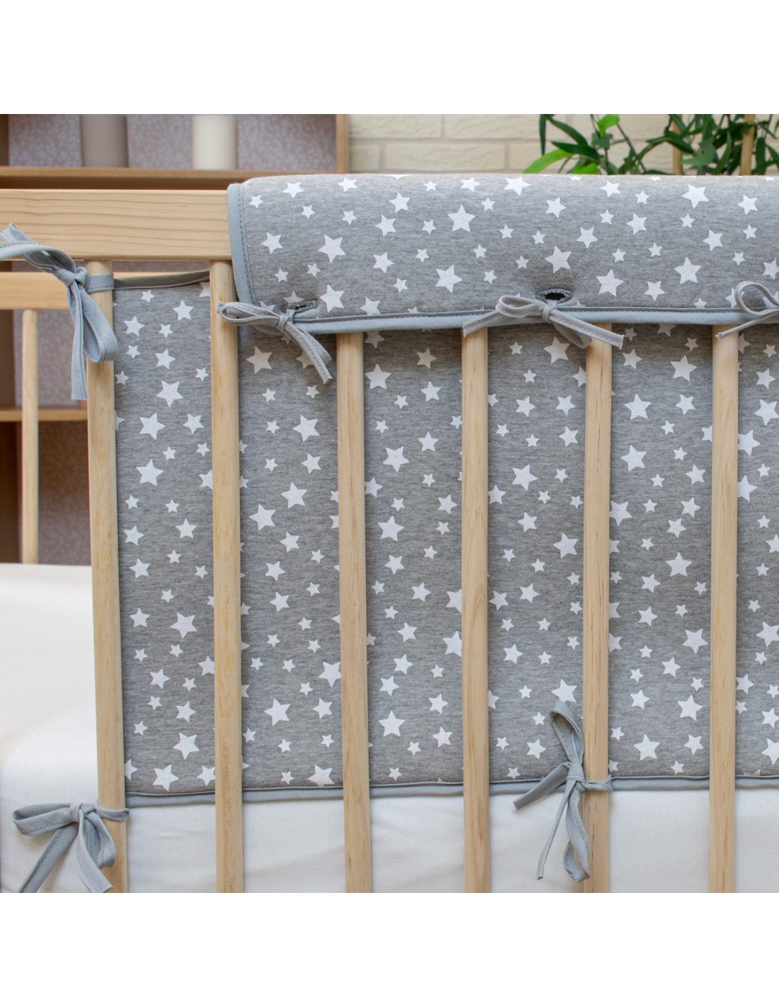 Il paracolpi per culla è realizzato per offrire comfort e sicurezza al bambino, in quanto copre la barra superiore e le doghe laterali della culla, impedendo al bambino di sbattere la testa e la bocca, soprattutto nella fase in cui inizia a stare in piedi e manca di stabilità. Il tessuto esterno è in cotone biologico al 100% con un'imbottitura in schiuma spessa 10 mm.
