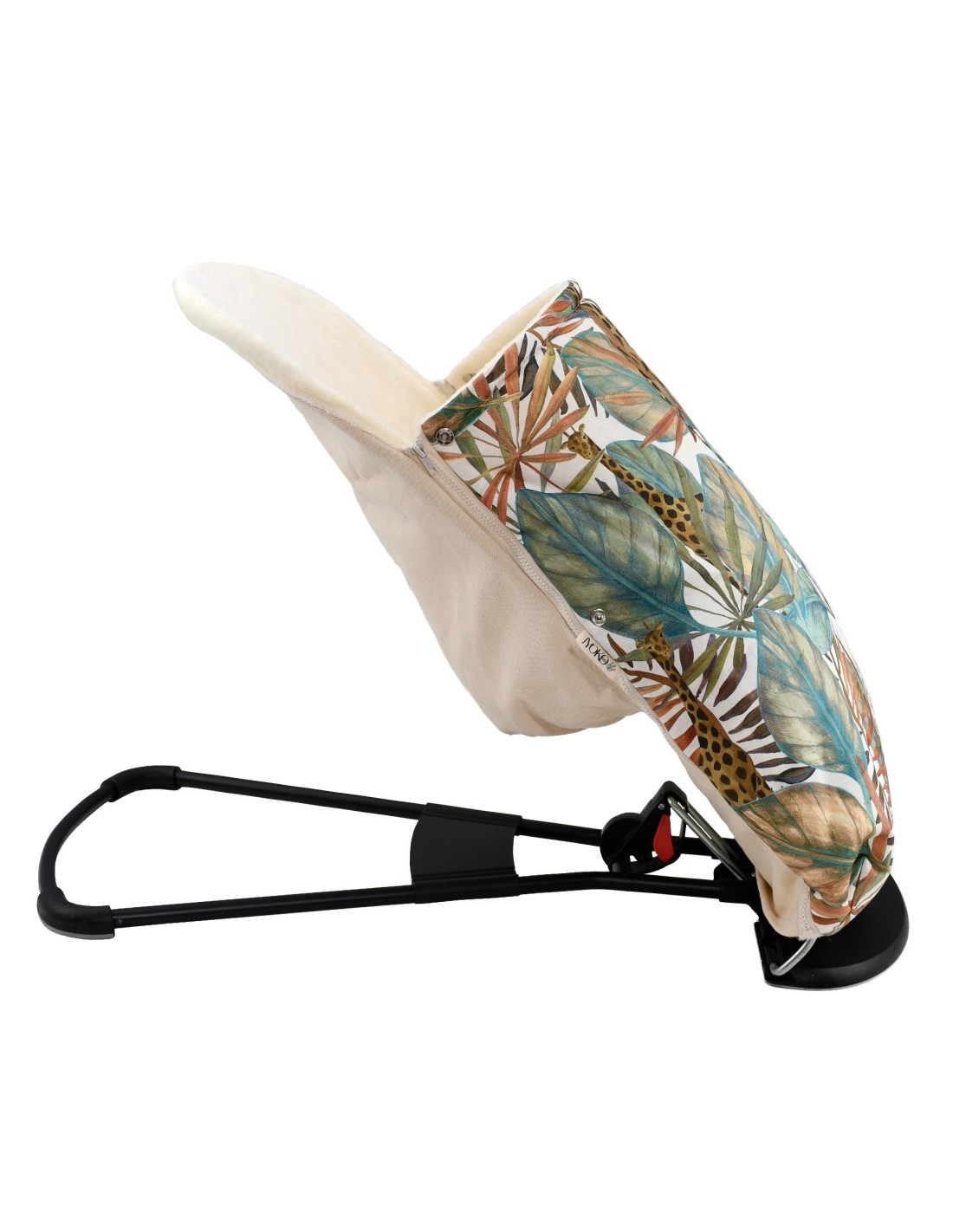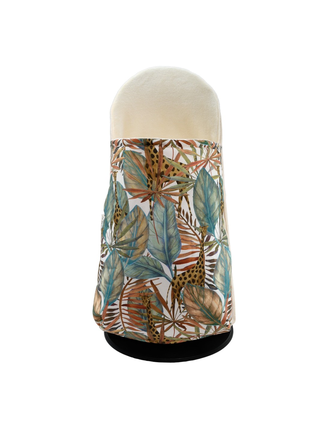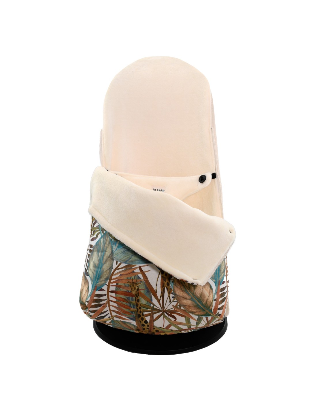 A camada externa da bolsa é feita de tecido estampado, 100% algodão, enquanto sua face interna é feita de pelúcia polar. A capa pode ser removida rapidamente graças aos zíperes em ambos os lados. Preenchido com uma camada de enchimento