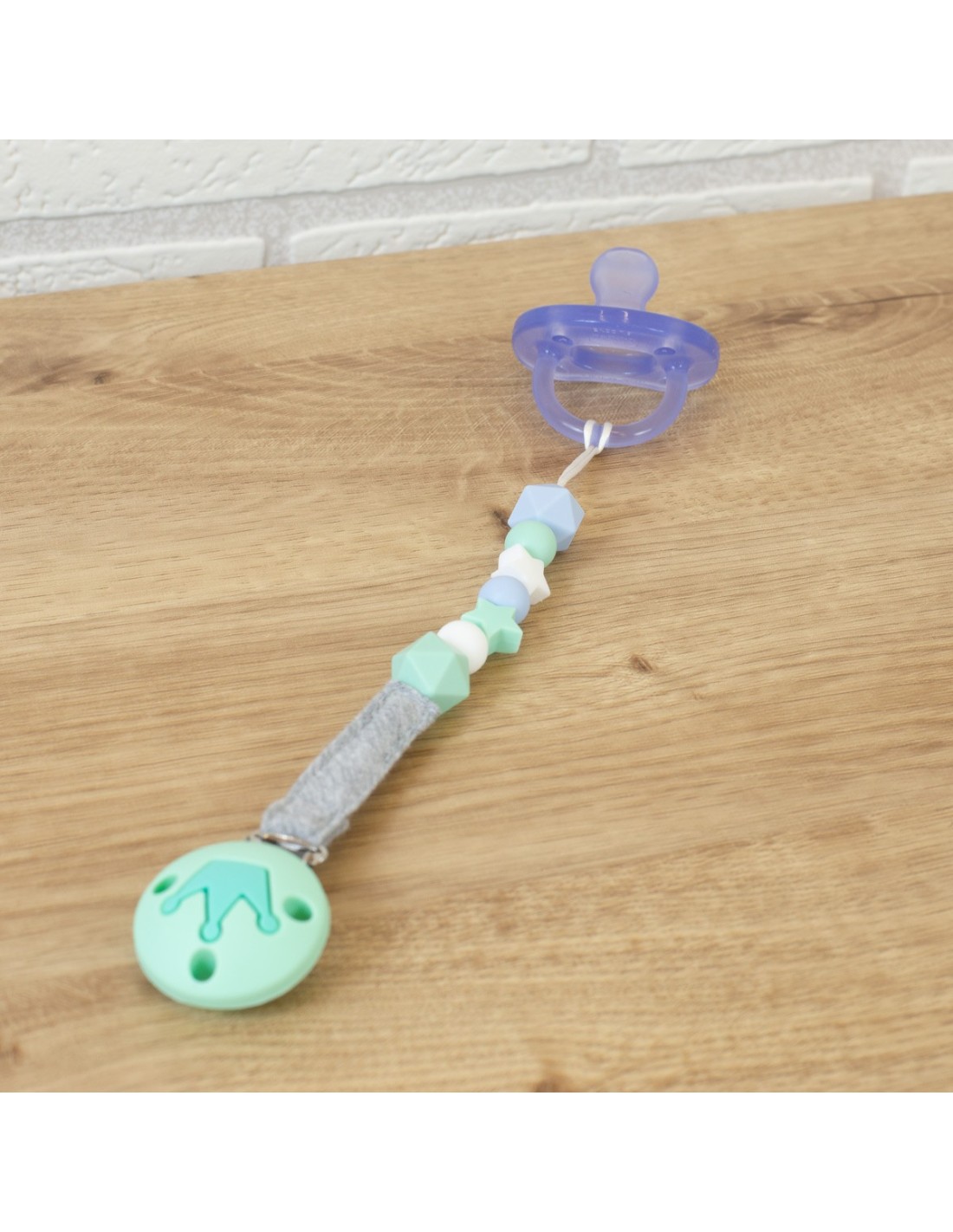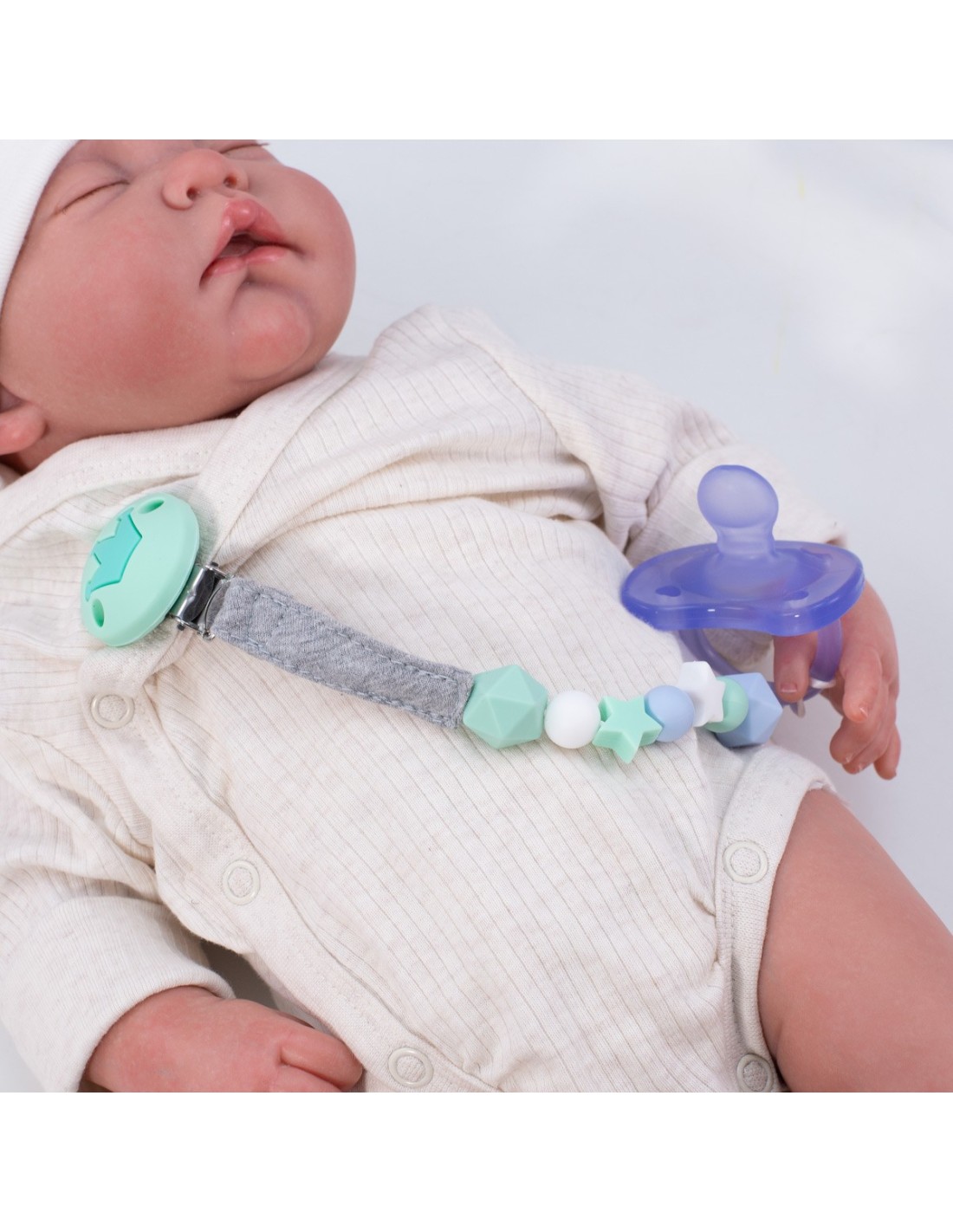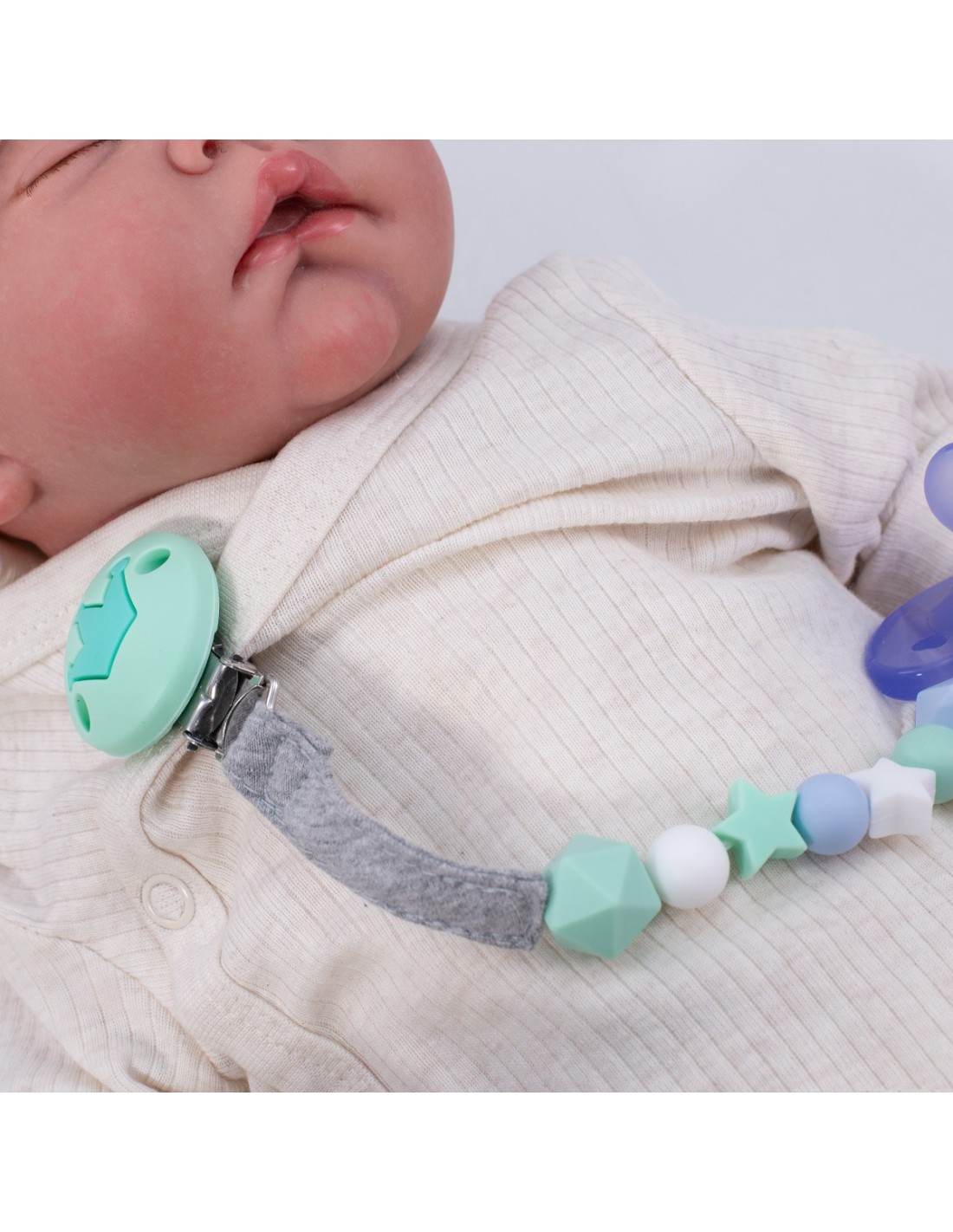 O porta-chupeta é feito com uma fita 100% algodão orgânico muito agradável ao toque e contas de silicone de qualidade alimentar para que o seu bebê possa mordiscá-lo e aliviar o desconforto causado pelos dentes ao sair.