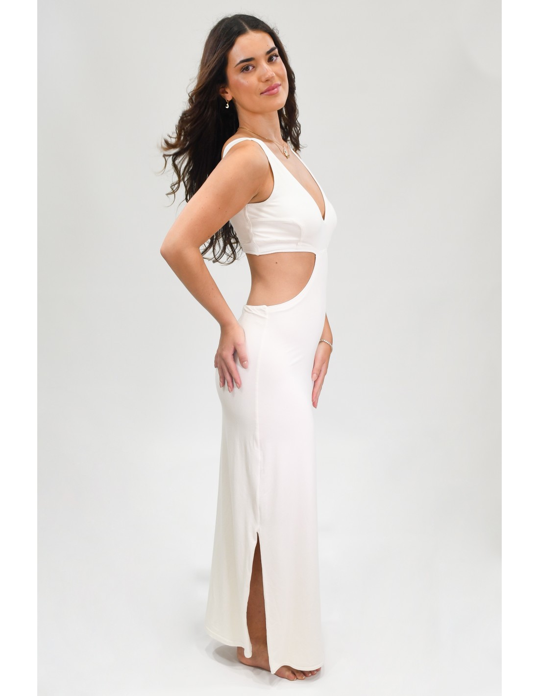 O Vestido Anna caracteriza-se pelo seu design moderno e ousado. Na frente, apresenta decote em V profundo que acrescenta um toque de sensualidade. As laterais do vestido possuem cortes estratégicos que não só destacam a figura, mas também proporcionam um ar contemporâneo e fresco.